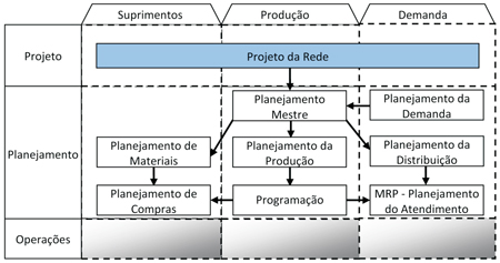 Desta forma, o planejamento mestre combina as previsões da demanda com os recursos da cadeia, como descrito no projeto de rede, criando um planejamento geral de movimentação de suprimentos pela cadeia que será integrado a cada sistema de gestão ERP das empresas participantes da SC ilustrado a seguir.