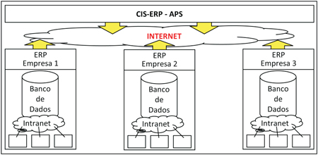 O grande desafio para as organizações no processo de integração da cadeia de suprimentos está relacionado à tecnologia de compartilhamento de informações e o resultado é que normalmente a informação não está disponível no local de trabalho, tanto em termos de tempo quanto em conteúdo. Nesse sentido o sistema ERP em nuvem da CIS-ERP APS utiliza um algoritmo de planejamento e programação finito baseado na Teoria das Restrições (TOC) onde, as cadeias de suprimentos são vistas como ligações entre várias empresas, envolvendo fornecedores dos fornecedores, fornecedores, a empresa, seus clientes e os clientes dos clientes. A configuração do ERP Cloud da CIS-ERP APS, ilustrada na próxima figura, envolve a utilização do projeto de rede para inserir uma descrição detalhada da cadeia, incluindo suas instalações, elos de transporte e outras características.