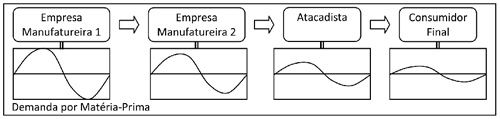 VMI (Vendor Managed Inventory), significa Inventário Gerenciado pelo Fornecedor. Portanto, no ERP em nuvem da CIS-ERP, há a disponibilidade de gerenciamento do estoque feito pelo fornecedor, de forma que os níveis de inventário da organização sejam conservados em valores pré-estabelecidos. Geralmente a informação que consta nos fornecedores é divergente da demanda do consumidor final, esta diferença é conhecida como efeito chicote. A Figura a seguir ilustra o resultado de alguns estudos do efeito chicote.