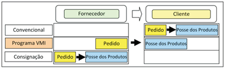 O efeito chicote pode ser reduzido ou mesmo eliminado através do uso do VMI, que é um modelo de compartilhamento de informações de demanda e estoque em uma SC. O ERP Cloud da CIS-ERP disponibiliza o VMI que tem como inovação a forma como distingue controle e posse, os quais normalmente eram transferidos ao mesmo tempo. A Figura a seguir apresenta um comparativo do VMI com os modelos, convencional e de consignação.