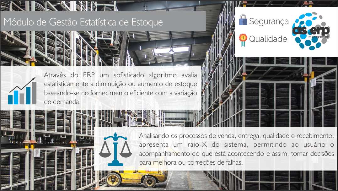 Este módulo de Gestão Estatística do ERP Cloud da CIS-ERP busca analisar o desempenho dos processos de vendas, entrega, qualidade e recebimento de forma a sinalizar sobre a necessidade de investimento na ampliação do estoque para aumentar o nível de serviço ao cliente ou reduzir o estoque para níveis seguros, porém mínimos. Este módulo é um importante instrumento de análise do estoque, apresentando uma radiografia do sistema que permite ao usuário verificar o que está acontecendo e assim, tomar decisões para corrigir as falhas ou melhorá-lo.